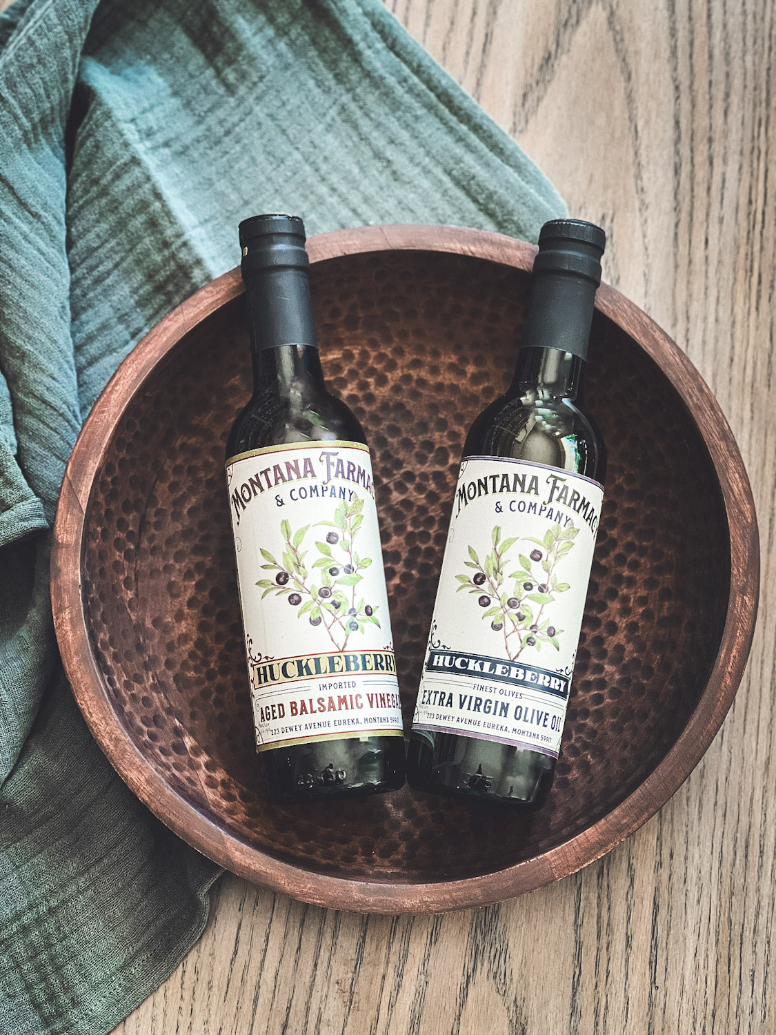 Montana Huckleberry Dark Balsamic and infused extra virgin olive oil both in 12.5 ounce bottles. This aged Balsamic is wonderful on a variety of items including pork, chicken even Ice cream and salads-- great for oil and vinegar blends as a dipping sauce. Grill up some salmon and drizzle some of this huckleberry on it or mix it with olive oil and some fresh herbs for a wonderful salad dressing. The olive oil is a spectacular pairing and is also amazing for making olive oil ice cream!