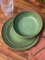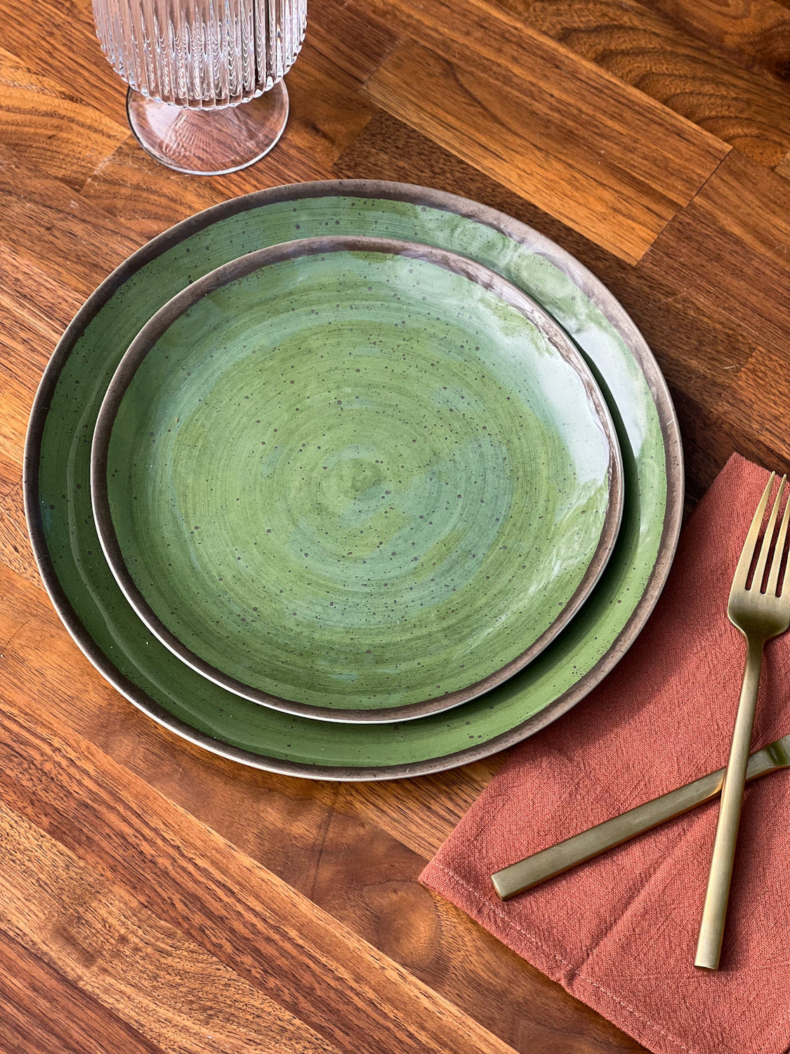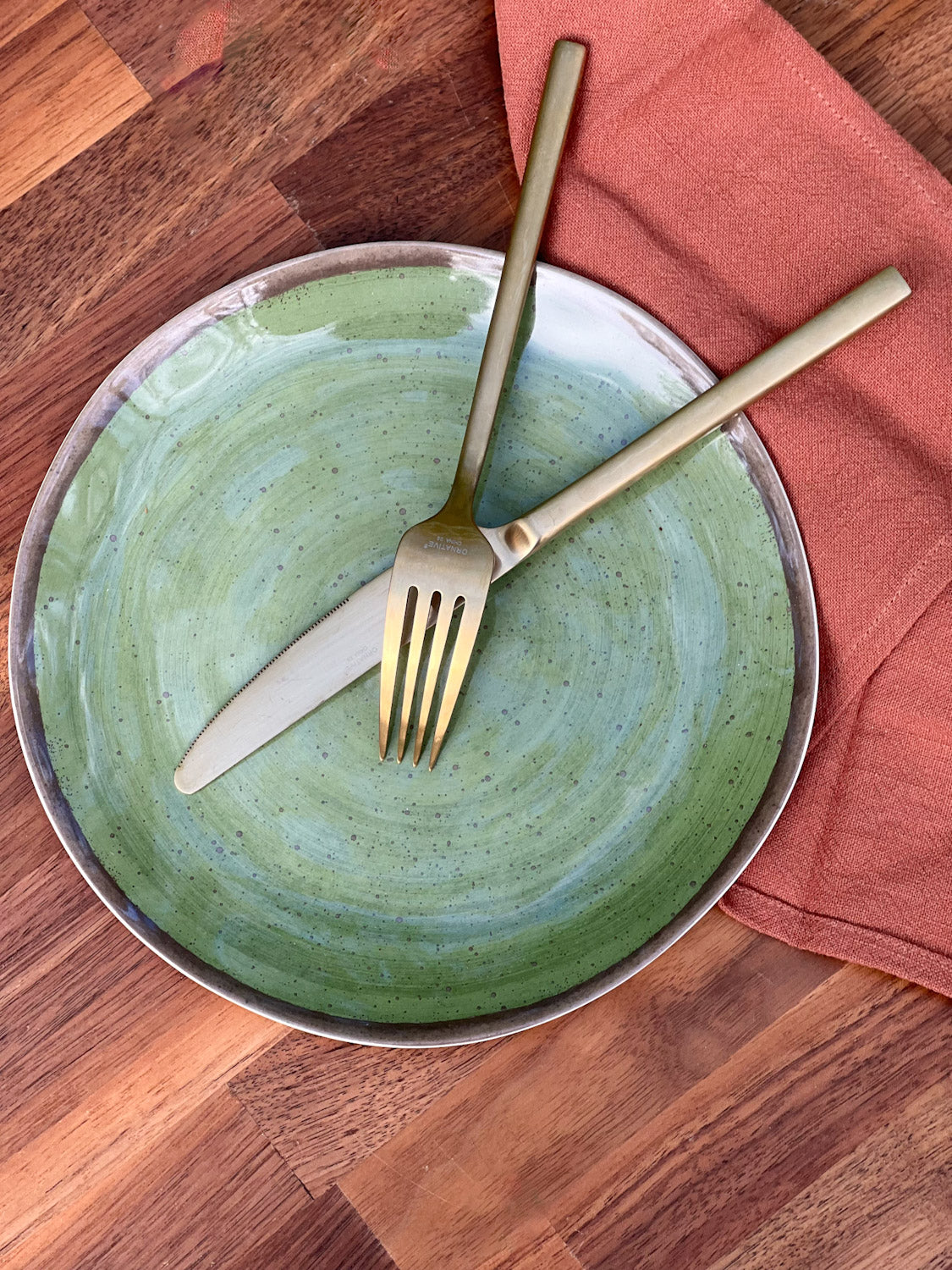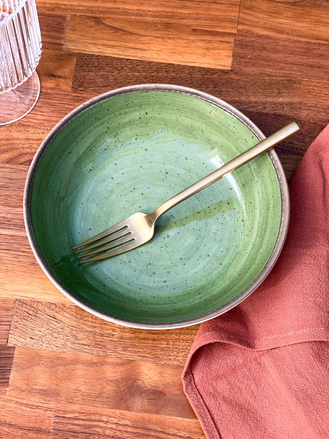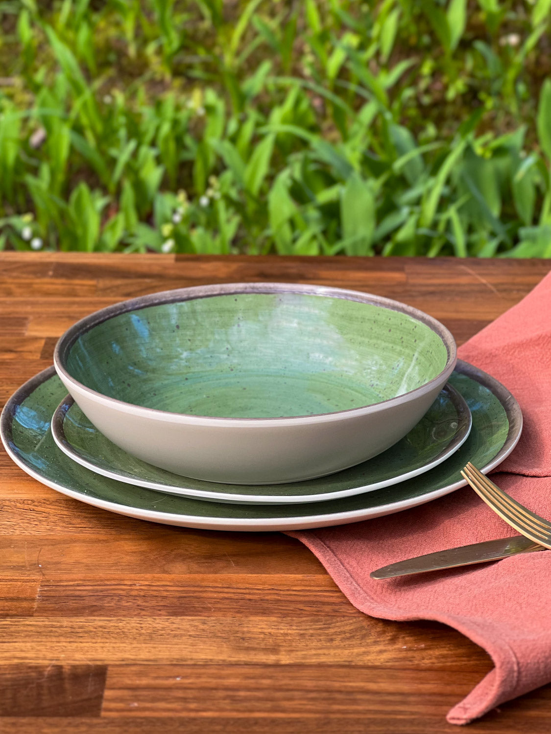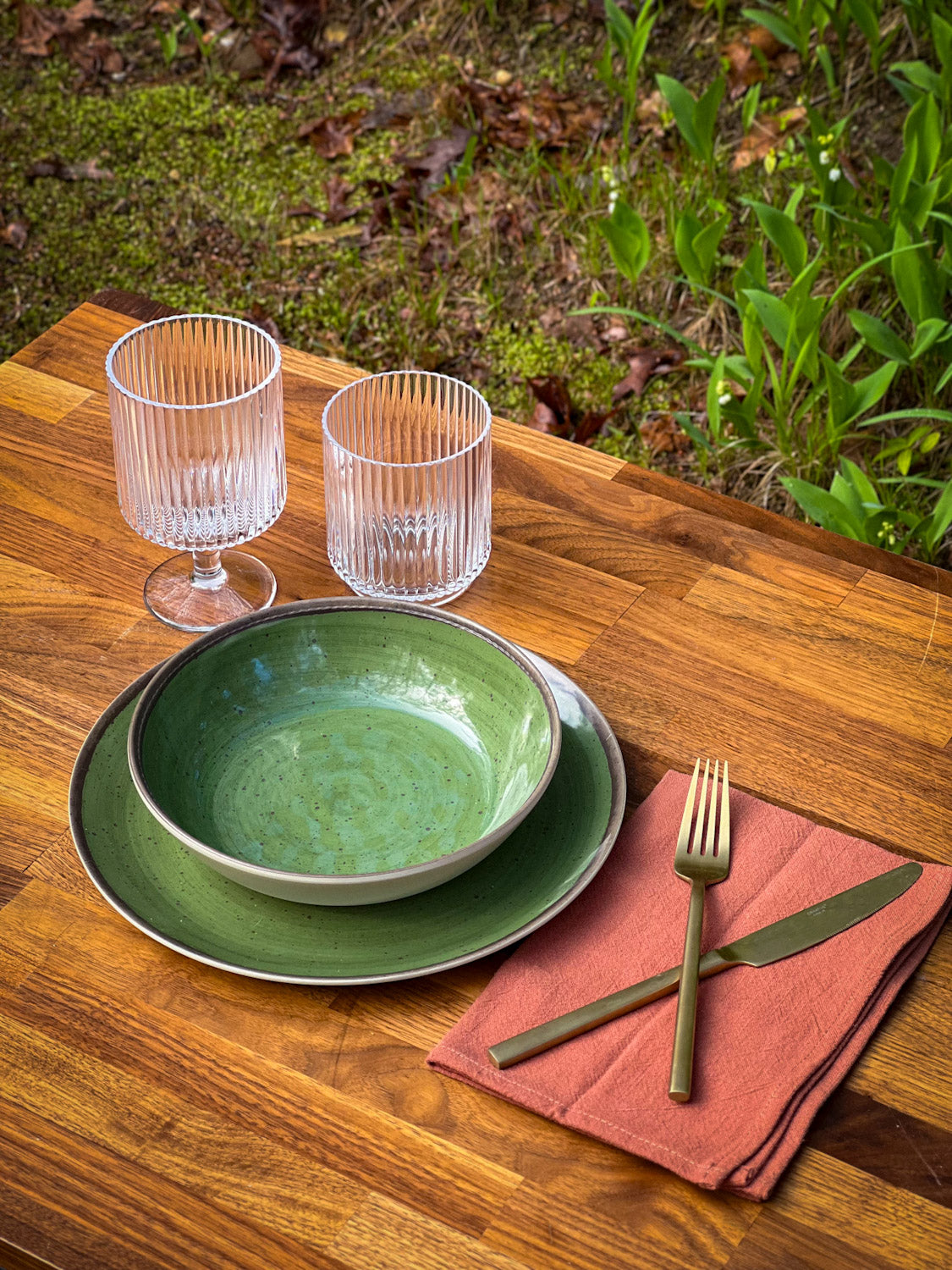 Sustainably created from melamine, these outdoor dinnerware items are almost indistinguishable from real pottery. The rustic glaze and speckled green tones are a stunning and natural addition to your outdoor table, beach, boat, or poolside entertaining.